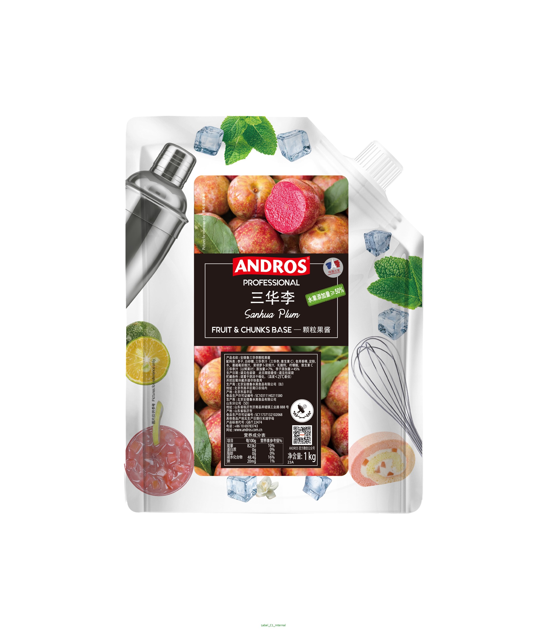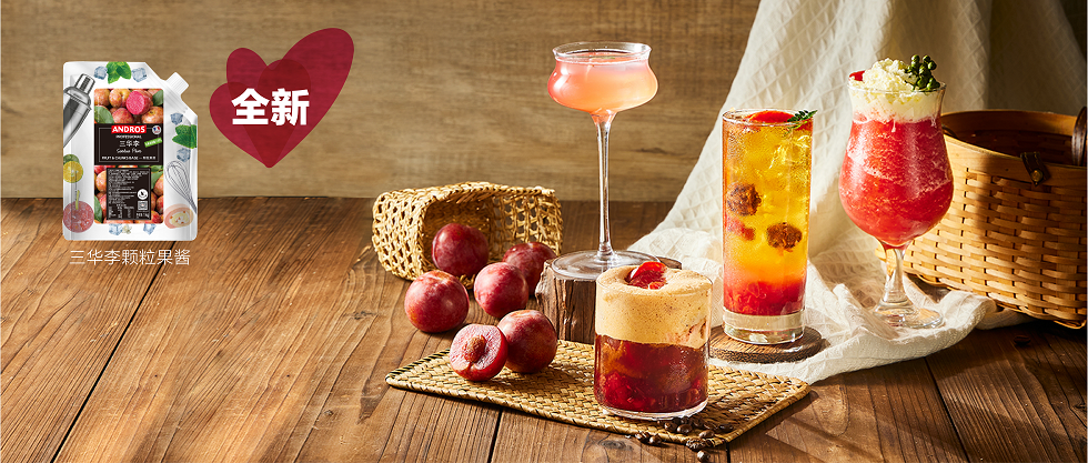 1、冰沙杯中加入三華李鮮果、安德魯三華李顆粒果醬、安德魯經(jīng)典風(fēng)味糖漿、